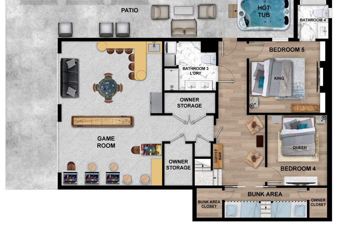 Come enjoy the amenities like the impressive back deck with swinging chairs or the expansive game room with wet bar. Guests can gather on the balcony each evening to watch the beautiful sunset.